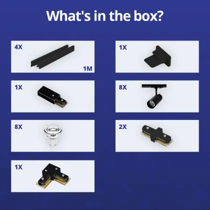 Beschreibung Bright Choice Komplettset 1-Phasen Rail L 2 x 2 Meter Schwarz | incl. 8x Spot + GU10 2700K 3W Dimmbar + Abschlusskappe, Stromanschluss und L -Verbinder