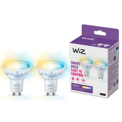Die Doppelpack 2x WiZ Smart LED-Spot GU10 PAR16 5W 400lm 36D | Höchste Farbwiedergabe - Dimmbar - Ersatz Für 50W ist eine effiziente GU10 LED-Lampe und der perfekte Ersatz für Ihre konventionelle Halogenlampe mit 50W und einem GU10-Sockel, bei welchem die zwei Stifte einen Abstand von 10 mm zueinander haben. Zudem strahlt das Produkt Licht in der Farbtemperatur aus und punktet durch eine lange Lebensdauer.