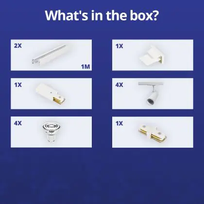 Beschreibung Komplettset 1-Phasen Rail 2 Meter Weiß | incl. 4x Spot + GU10 2700K 3W Dimmbar + Abschlusskappe, Stromanschluss und I-Verbinder