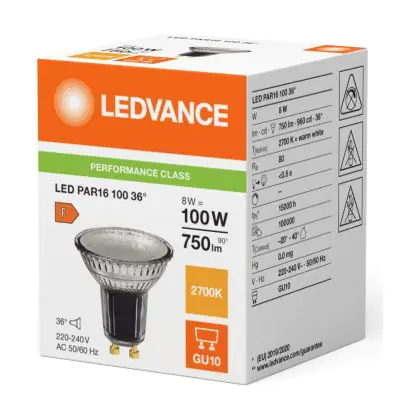 Die Ledvance LED PAR16 GU10 Reflektor 8W 750lm 36D - 827 Extra Warmweiß | Ersatz Für 80W ist eine effiziente GU10 LED-Lampe und der perfekte Ersatz für Ihre konventionelle Halogenlampe mit 80W und einem GU10-Sockel, bei welchem die zwei Stifte einen Abstand von 10 mm zueinander haben. Zudem strahlt das Produkt Licht in der Farbtemperatur 2700K - Extra Warmweiß aus und punktet durch eine lange Lebensdauer.