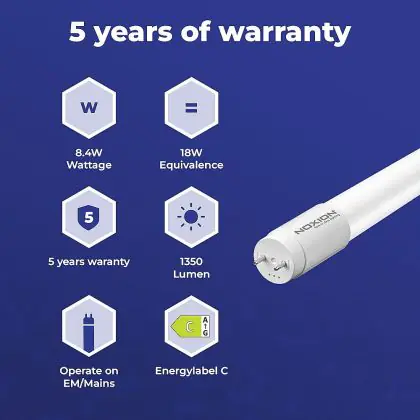 Die T8 LED-Röhre von Noxion kann nicht nur mit einer langen Lebensdauer von 50000 Stunden, sondern auch mit einer hohen Lumeneffizienz von lm/W überzeugen. Sie strahlt ihr Licht in der Farbtemperatur aus und wird mit betrieben. Im Preis ist zudem eine All-In-Garantie von 5 Jahre Jahren enthalten.