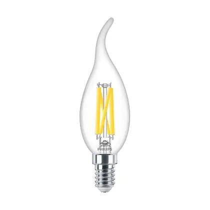 Die Mehrfachpackung 10x Philips MASTER LED E14 Gebogen-tip Kerze Fadenlampe Klar 3.4W 470lm - 922-927 Dim To Warm | Höchste Farbwiedergabe - Dimmbar - Ersatz Für 40W ist eine effiziente E14 LED-Lampe mit Retrodesign und der perfekte Ersatz für Ihre konventionellen 40W Lampen mit E14. Zudem strahlt sie Licht in der Farbtemperatur aus und punktet durch eine lange Lebensdauer.