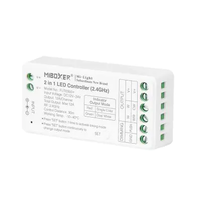 Der 2-in-1 RF-LED-Controller ist ein leistungsstarker und flexibler Empfänger für die drahtlose Lichtsteuerung. Mit zwei Kanälen ermöglicht er die Steuerung von einfarbigen sowie CCT Warm-Kaltweiß-Lichtquellen. Die 2,4-GHz-Funktechnologie sorgt für eine zuverlässige Verbindung mit einer Reichweite von bis zu 30 Metern.