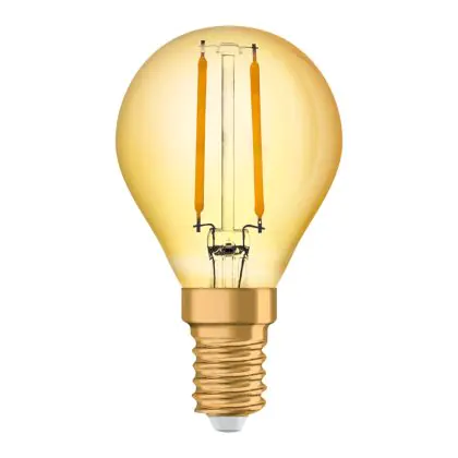 Die Osram Vintage 1906 LED E14 Kugel Fadenlampe Gold 2.5W 220lm - 824 Extra Warmweiß | Ersatz für 25W ist eine effiziente E14 LED-Lampe mit Retrodesign und der perfekte Ersatz für Ihre konventionellen 22W Lampen mit E14. Zudem strahlt sie Licht in der Farbtemperatur 2400K - Extra Warmweiß aus und punktet durch eine lange Lebensdauer.
