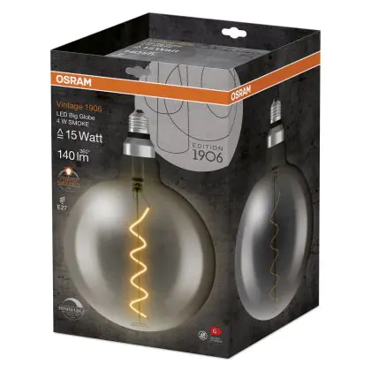 Die Osram Vintage 1906 LED E27 Globe Fadenlampe Smoke 200mm 5W 110lm - 818 Extra Warmweiß | Dimmbar - Ersatz für 25W ist eine effiziente E27 LED-Lampe mit Retrodesign und der perfekte Ersatz für Ihre konventionellen 25W Lampen mit E27. Zudem strahlt sie Licht in der Farbtemperatur 1800K - Extra Warmweiß aus und punktet durch eine lange Lebensdauer.